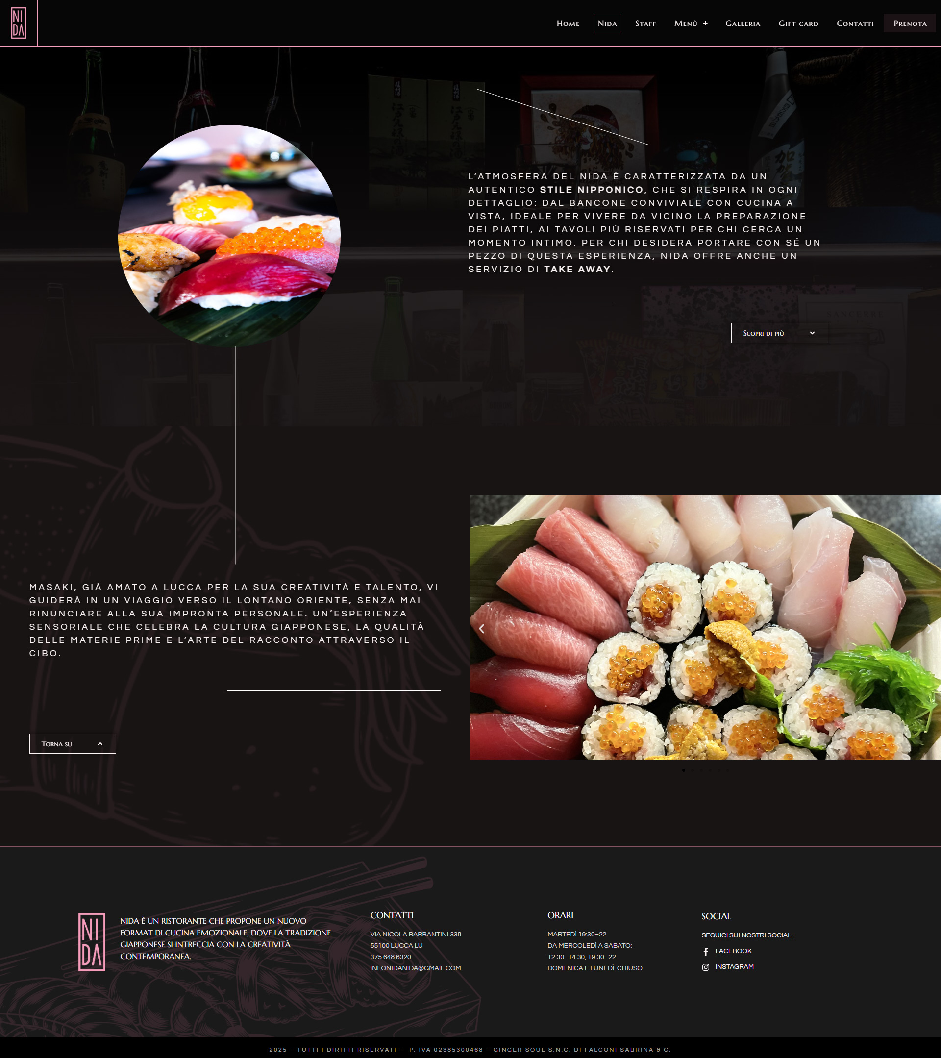 Nida è un ristorante a Lucca di cucina fusion giapponese e italiana. In sinergia con lo spirito del locale abbiamo realizzato un sito web dinamico con possibilità di prenotazione diretta e un’organizzazione dei contenuti e un design che rifletta l’atmosfera fusion del ristorante.